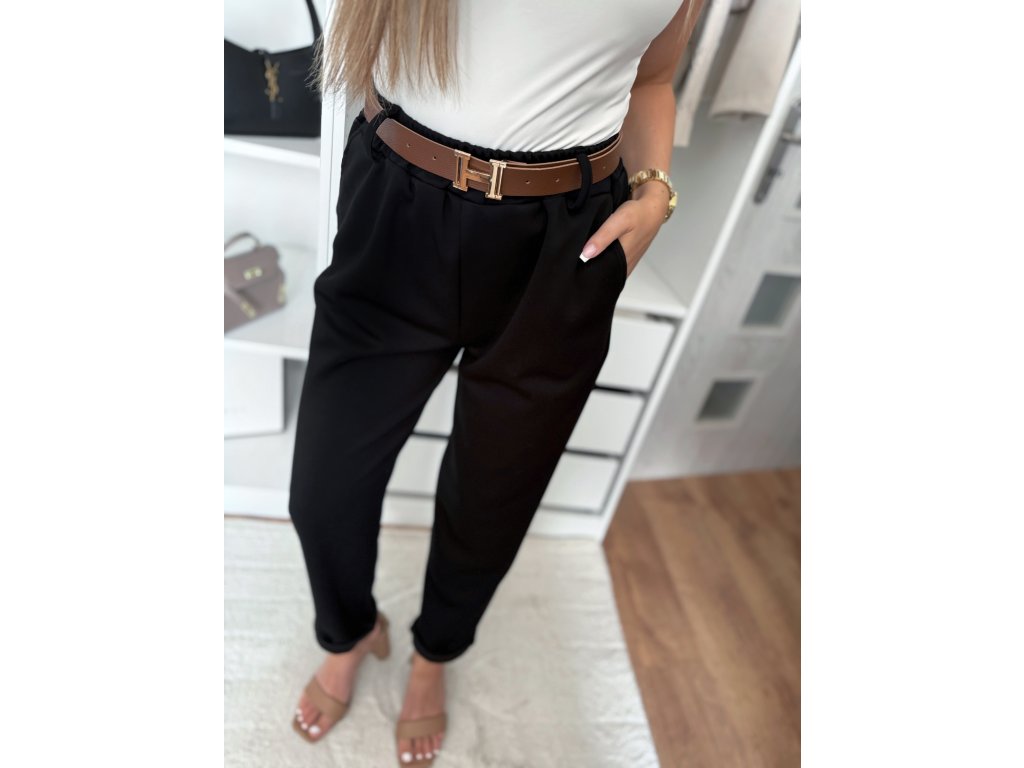 Kalhoty rovného střihu s hnědým páskem se zlatou sponou